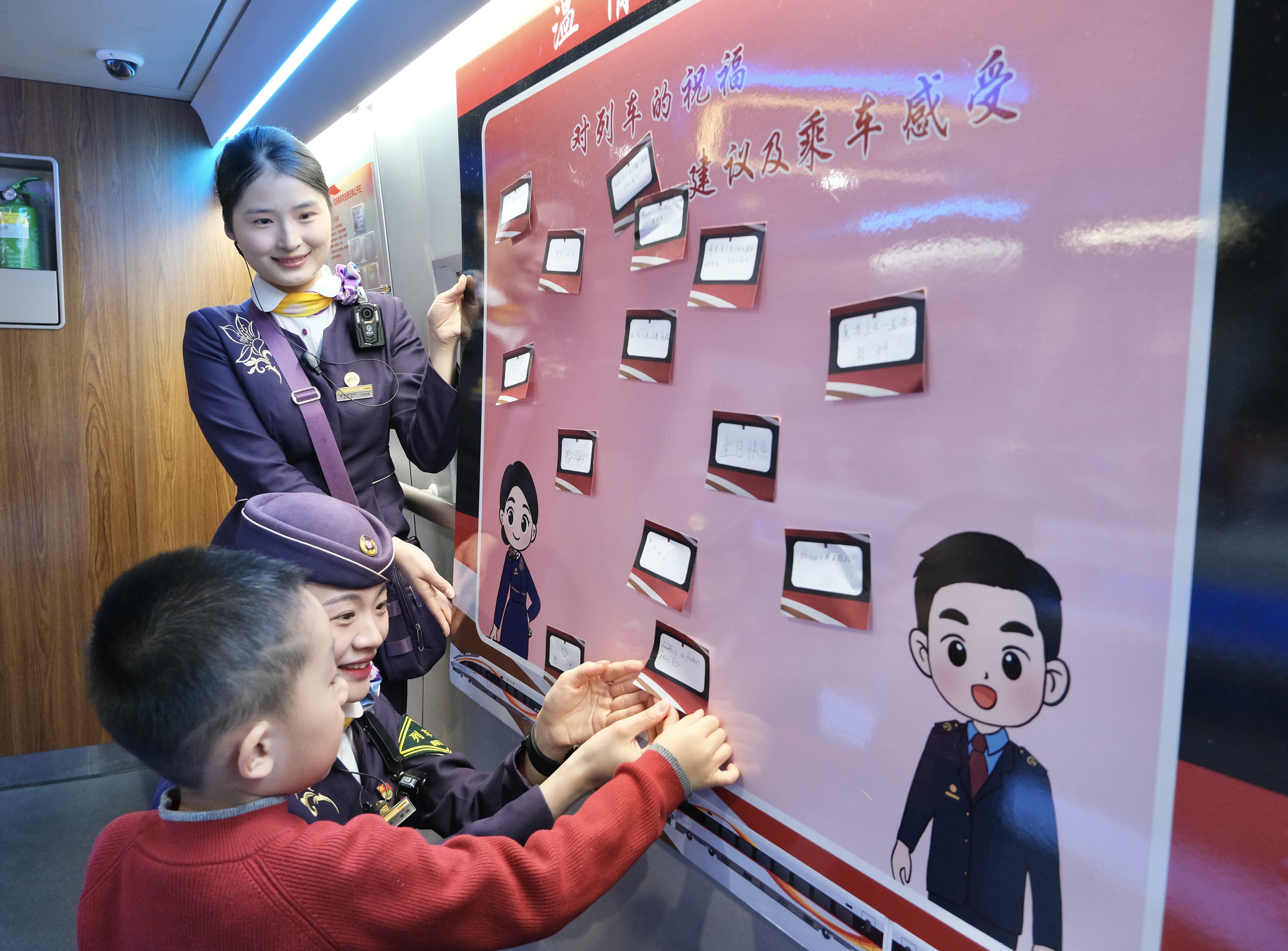 发车前半小时,列车门口与车厢内已布置成一处小小的纪念园地。巨幅展板上,贴满了过去一年里的暖心抓拍瞬间:乘务员俯身协助老人的背影、小朋友破涕为笑接过玩具的刹那、旅客与班组人员的温馨合影……每一张照片背后,都藏着一段难忘的旅途故事。