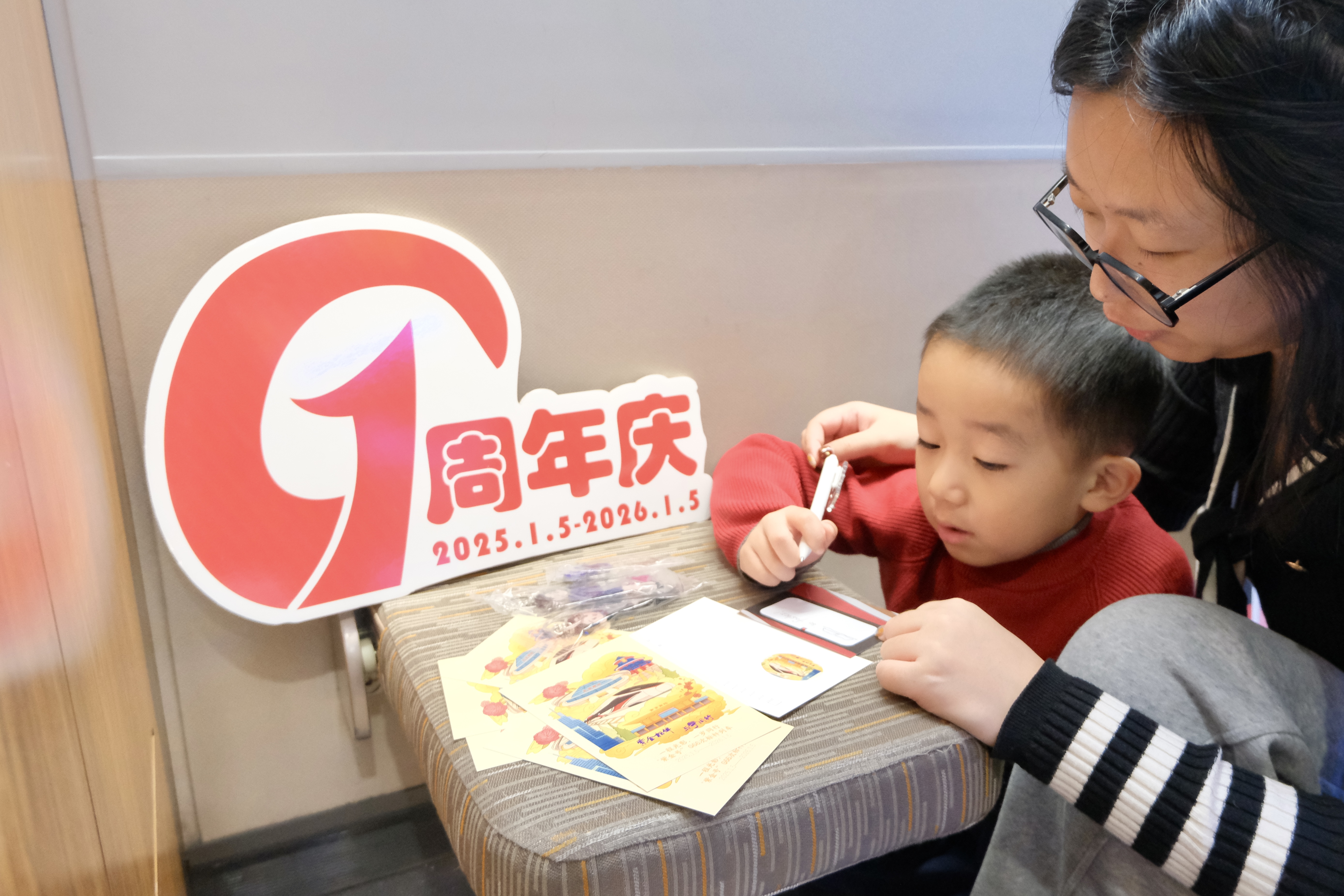 2026年1月5日,值G66次“紫金号”标杆列车开行一周年,儿童旅客粘贴周年寄语。黄雯娴摄。