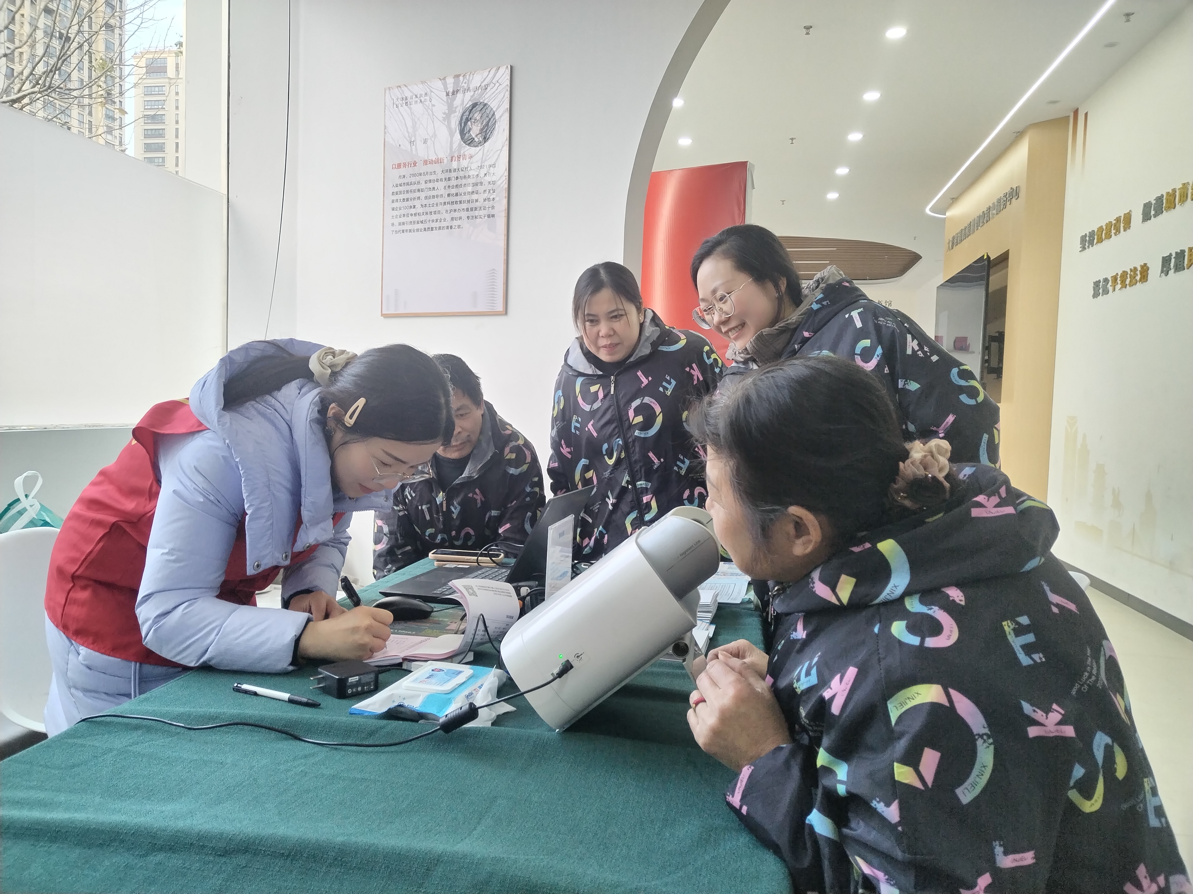 活动当天,该医院眼科专家组成医疗志愿服务队,在社区暖心驿站设立“一站式”检查区,为居民提供视力检查、裂隙灯检查、眼底照相等眼健康服务。针对近视、白内障、黄斑病变、青光眼等常见眼病的防控,志愿者详细解答居民疑问,建立个人档案,给出个性化诊疗建议。