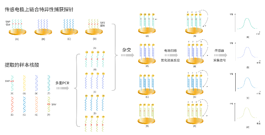 通过搭载于微阵列芯片上的特异性捕获探针,将经过PCR扩增出的靶标序列转换为电信号,由芯片读取不同的电信号从而对目标核酸片段进行定性或定量分析。