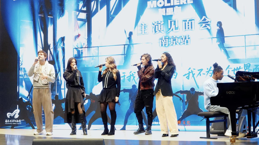 为让观众深度贴近这部剧作,南京保利大剧院特别策划音乐剧《莫里哀》主演见面会,饰演“莫里哀”的亚尼斯·理查德、饰演“孔蒂亲王”的阿比·贝纳多特、饰演“玛德莱娜·贝雅尔”的玛尔戈,饰演“阿尔芒德·贝雅尔”的阿莉娅、饰演“玛奇丝”的克伦蒂娜·柯里耶、饰演“路易·贝雅尔”的维尼修斯·蒂默曼悉数到场,与南京观众分享台前幕后的故事,原声献唱剧中《命运使然》《你终将坠落》《爱的私语》《我早已习惯做梦》等金曲,酣畅淋漓的歌声,点燃现场观众热情,更加期待着即将到来的精彩演出。