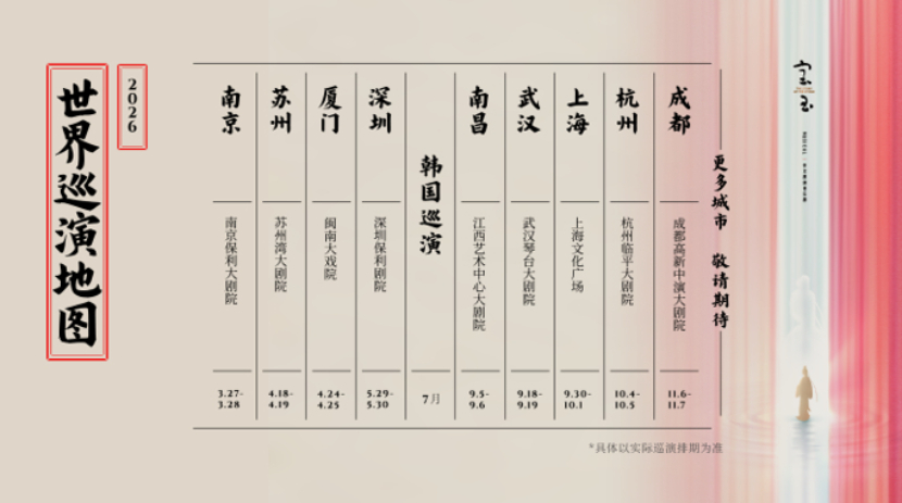 制作人王海笑表示,“《宝玉》自首演来,承载着观众与业界的鼓励与支持。我们感恩每一份赞赏,珍惜每一句的建议。主创团队将基于首轮巡演的宝贵经验与各方反馈,开启修改与精进,让《宝玉》以更臻完美的面貌,回馈观众的呵护与期待。”并公布2026年度巡演计划,“2026年3月27日—3月28日,《宝玉》将在南京保利大剧院上演并开始二轮巡演,值得一提的是,我们将迈向更广阔的舞台,赴韩国进行巡演,向世界讲述‘金陵故事’!”