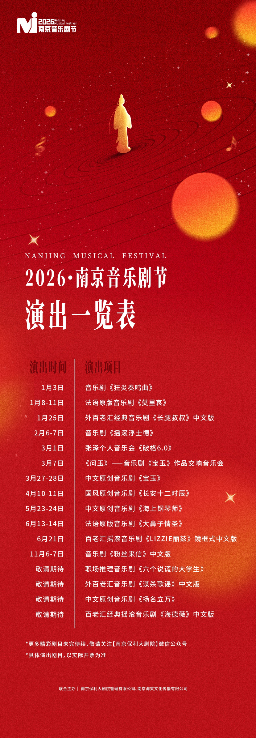 从国风美学到先锋锐度,从经典佳作到破圈爆款,2026年南京音乐剧节的剧目单,题材多样,风格多元,诚意满满,令人目不暇接。