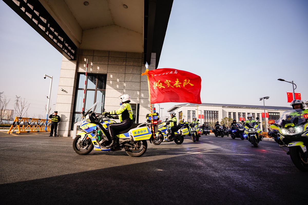1月10日上午,南通市公安局举行警用摩托车集中发放仪式,向快反突击队授旗。随着一声“出发”指令,队员们驾驶全新警用摩托车整齐划一从南通公安民警实战训练中心驶出,开展首次集中巡逻,以守护平安的实际举措庆祝中国人民警察节。