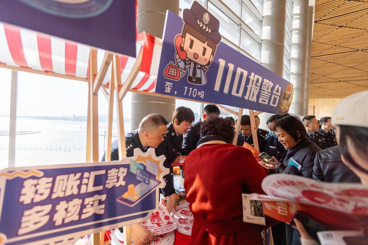 图为1月9日,南通民警向群众宣传反诈防诈知识以及如何正确拨打110。