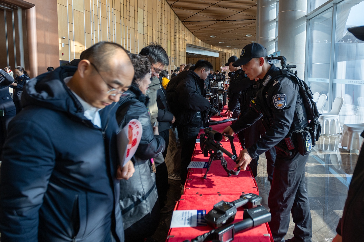 图为1月9日,南通民警在警务装备展区,向群众介绍警务装备。