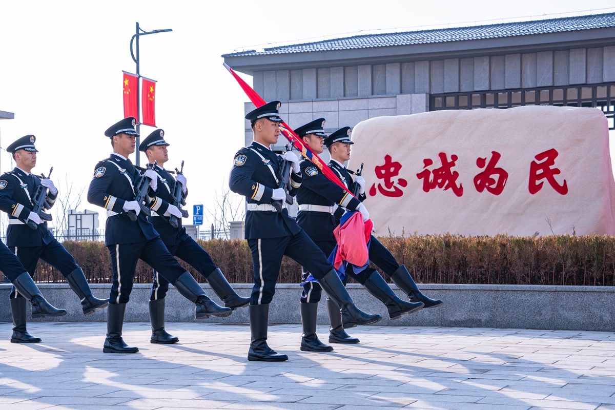 图为1月10日上午,南通公安举行升警旗仪式,护旗队员护卫警旗走向升旗台。
