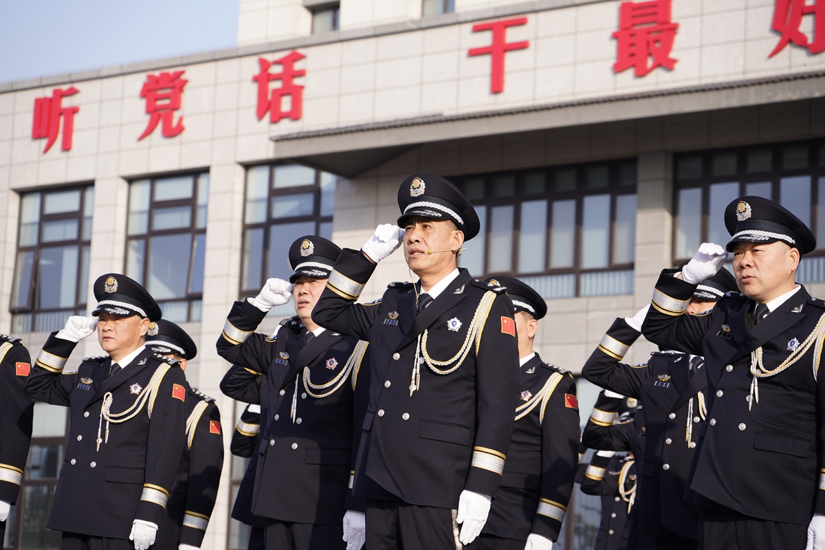 图为1月10日上午,全国公安系统二级英雄模范、南通市公安局刑侦支队政委贾东涛领誓,全体民警高举右拳、庄严宣誓,重温公安机关人民警察誓词。