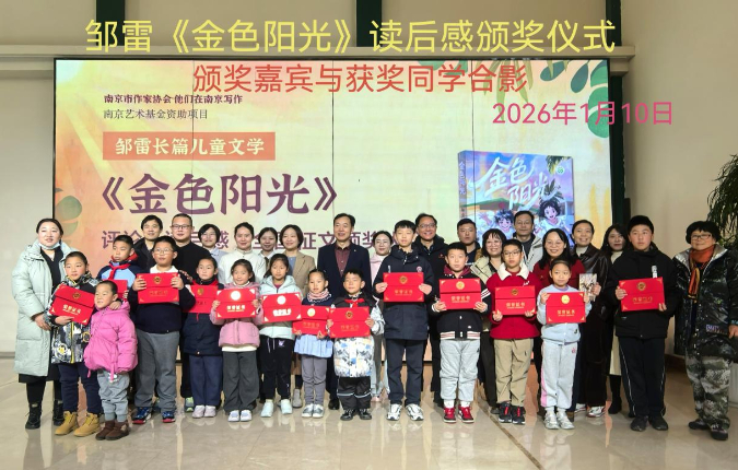 1月10日上午,长篇儿童文学《金色阳光》评论(读后感)全国征文大赛颁奖活动在南京圆满落幕。本次活动由江苏经济报、南京江北新区文联、金陵图书馆联合主办,南京创意中心、南京世界文学客厅、南京江北新区作家协会承办,旨在鼓励青少年及家庭通过深度阅读与创作,感悟家国情怀,致敬无私奉献精神。