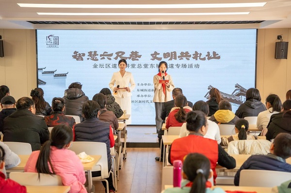 礼让传千古,睦邻暖万家。在常州金坛东城街道新时代文明实践所内,“智慧六尺巷・文明共礼让”道德讲堂活动温情开讲。活动在经典的《公民道德歌》中拉开序幕,现场,有志愿者娓娓讲述“商居一家亲”的共建故事,有情景剧生动演绎“退让智慧”化解社区纠纷,还有孩子们朗诵诗歌致敬退休党员。“多一分理解,少一分计较,有事好好谈。”应邀参加活动的冯阿姨还坦诚地和大家分享待人之道。