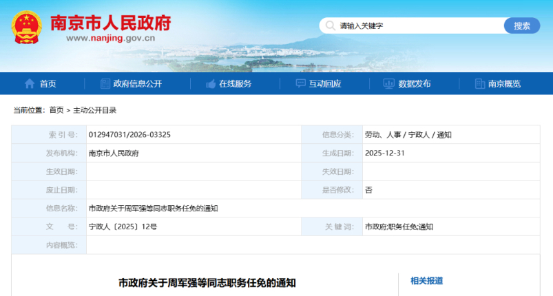 近日,南京市人民政府发布关于周军强等同志职务任免的通知。