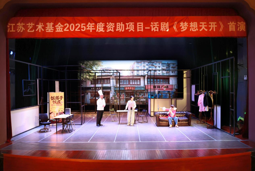 在众多剧目中,《梦想天开》无疑是焦点中的焦点。由江苏艺术基金2025年度资助项目-话剧《梦想天开》,此次既是首演也是展演季的开幕剧。这部剧以珠江路三位“生活演员”的荒诞日常为切入点:他们周一穿西装“批贷款”,周三系围裙“卖盒饭”,周五穿护士服“查房”,这是三位主角“假装上班”的故事,一场场啼笑皆非的圆谎背后,是当代年轻人在梦想与现实间的挣扎与坚守。