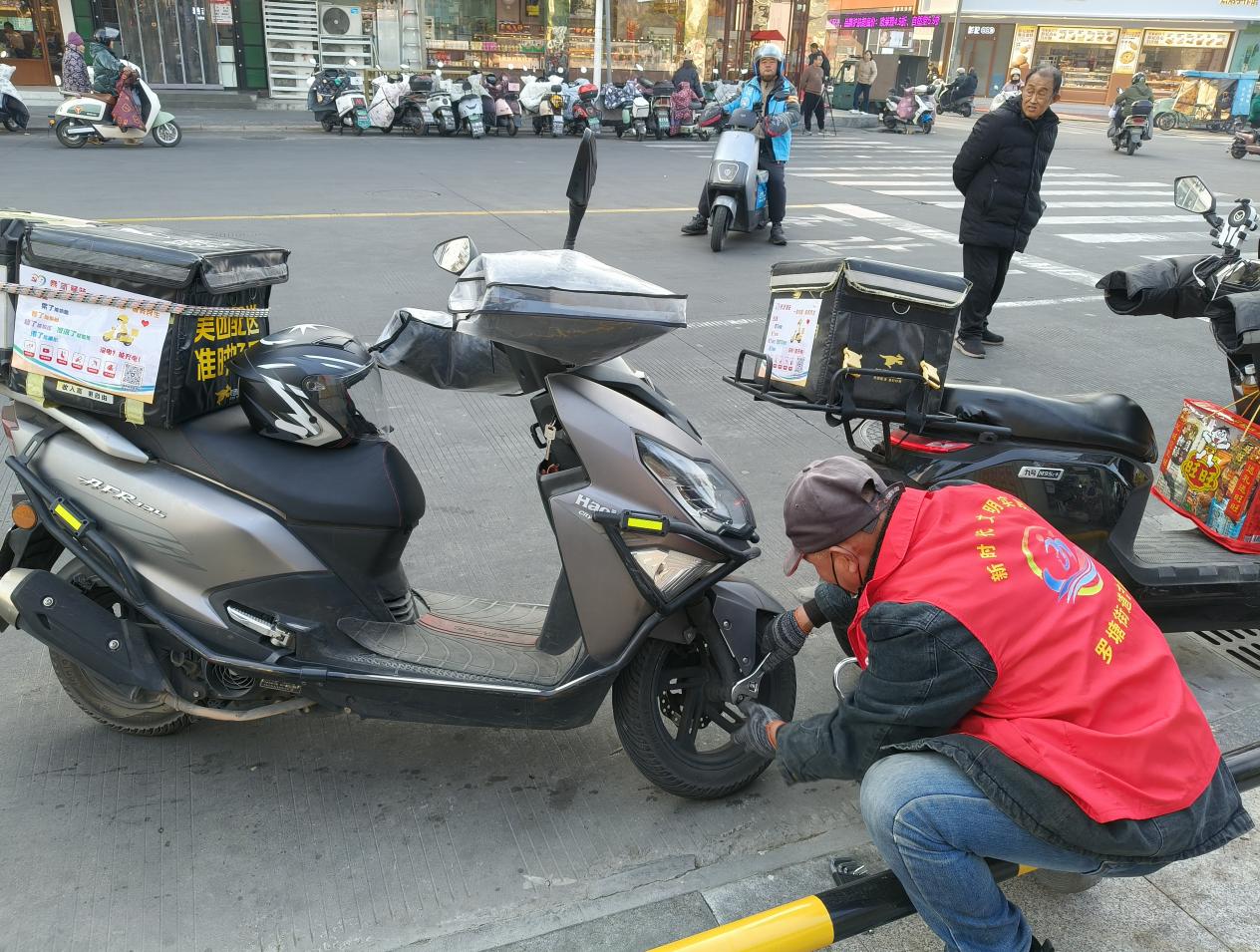 驿站精准送暖,服务直抵心坎。活动聚焦新就业群体日常工作与生活需求,提供了多项暖心务实服务。在车辆快检服务点,维修人员为骑手们的电动车检查关键部件,免费调试故障、更换小零件,并讲解保养知识,为安全骑行保驾护航。驿站内设置了专属寄语贺卡和社群招募点,既收集新年心愿与服务建议,也搭建起即时便利的信息互助平台。区妇联送来装有暖宝宝、应急药品等物资的“暖心包”,咖啡补给站供应免费热饮,丝丝暖流驱散了冬日寒意,更温暖了奔波的身影。
