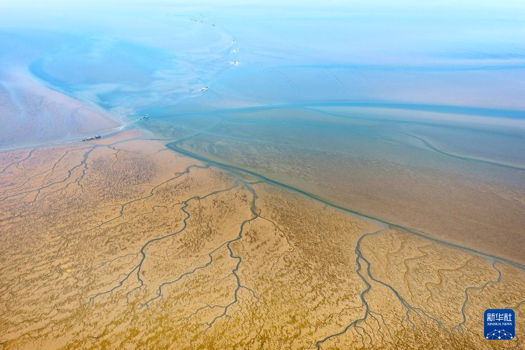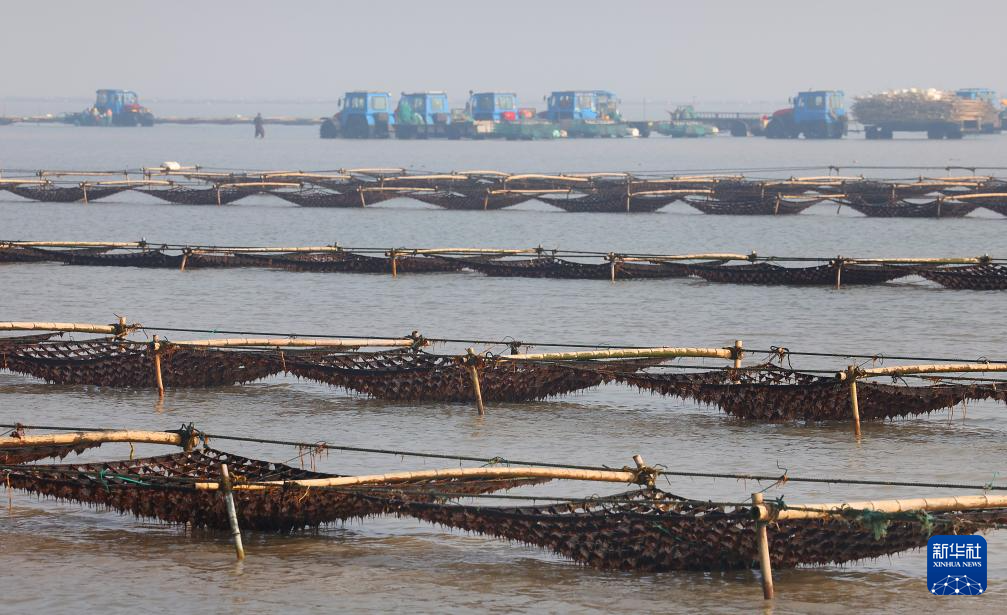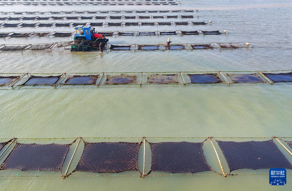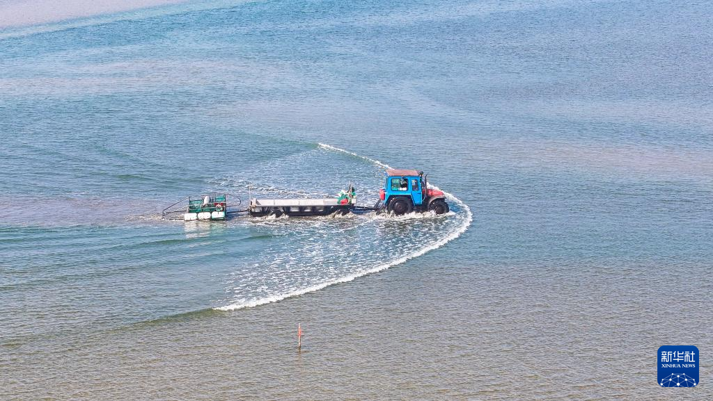 1月15日,养殖户驾驶拖拉机趁着退潮出海采收紫菜(无人机照片)。