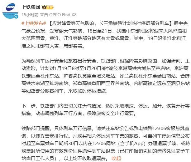 为确保列车运行安全和旅客出行安全,铁路部门根据降雪影响范围,加强研判,主动避险,计划对1月19日8时至1月20日8时途经京港高铁古城东至芦庙站、京沪高铁定远至徐州东站、沪蓉高铁黄庵至墩义塘站、徐兰高铁徐州东至砀山南站、合蚌高铁水家湖至蚌埠南站、郑阜高铁阜阳西至界首南站、合新高铁定远东至泗县东站等线路部分旅客列车,采取临时停运措施。铁路部门将密切关注天气情况,适时采取限速、停运、加开、恢复开行等措施,动态调整列车开行方案,保障旅客安全出行需要。