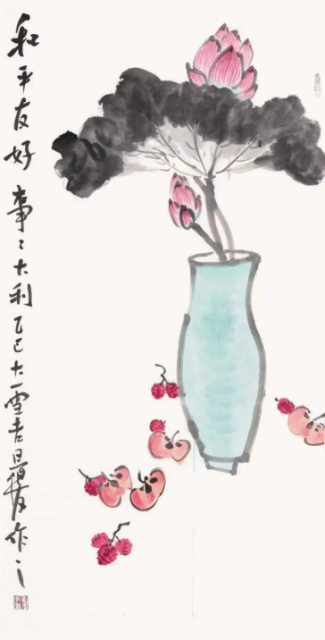 此次被收藏的《和平友好 事事大利》是翟优创作的精品力作,作品以中国传统视觉象征手法与谐音文化为创作核心,构建出层次丰富、意蕴深远的艺术表达。画面中央,瓷瓶中盛放的莲花清雅脱俗,“荷”谐音“和”、“瓶”谐音“平”,二者相融相生,构成“和平”的美好文化隐喻;而莲花本身所承载的纯洁、平衡之意,更深化了不同文明和谐共处的理念。围绕中心构图的四枚红柿与九颗荔枝相映成趣,“柿”谐音“事”、“荔”谐音“利”,寓意“事事顺遂、福泽绵长”。作品笔墨清雅灵动,色彩温润和谐,将东方美学的含蓄之美与当代国际视野完美融合。