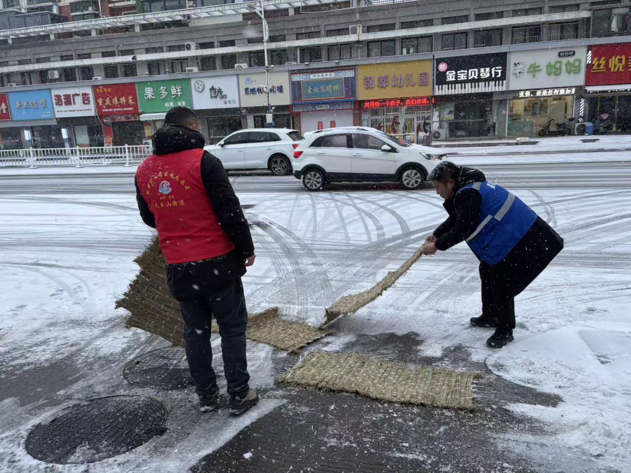 大家手持铁锹、雪铲等工具,对小区各出入口的积雪进行集中清扫,重点铲除路面结冰区域;同时在易滑路段均匀撒布融雪盐,铺设防滑草垫,从“清、融、防”多方面入手,彻底消除路面安全隐患。经过数小时的奋战,小区出入口积雪全部清理完毕,防滑措施落实到位,为居民营造了安全、通畅的出行环境,路过的张阿姨点赞道:“社区想得太周到了!刚出门就看到干净的路面和防滑草垫,再也不用担心滑倒了,心里特别暖和。”