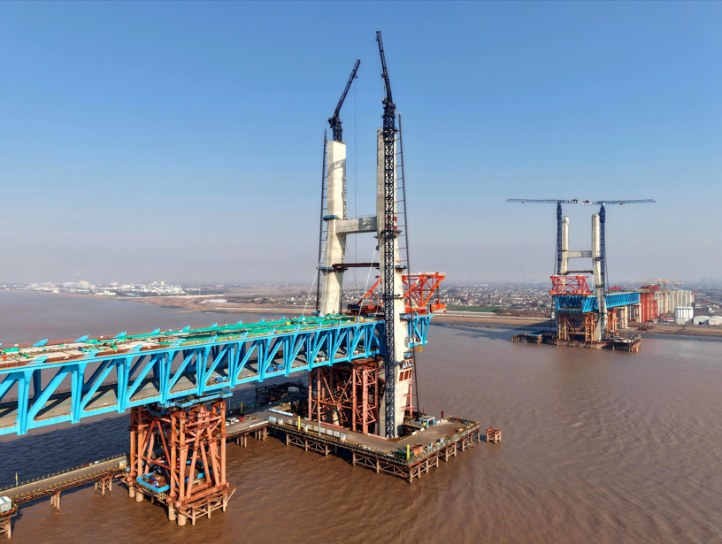 崇启公铁长江大桥是上海至南京至合肥高铁控制性节点工程,全长4.09公里,横跨长江入海口北支航道。其构造为双层布置的公铁两用桥,上层为双向6车道、时速100公里的一级公路,下层为时速350公里的双线高速铁路+时速250公里的双线城际铁路。(徐帆 王世琪 孟庆虎)