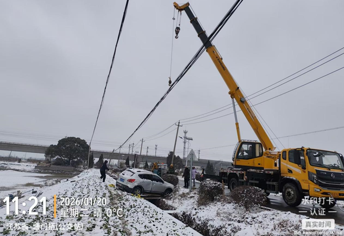 在宜兴,一辆白色SUV因路滑陷入路边沟渠,人保查勘员顶风冒雪火速赶到现场,在积雪中蹲身细致查勘,同时协调拖车、吊车开展救援,全程坚守直至车辆成功脱困。