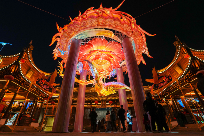 2025年12月30日,市民游客在南京市秦淮区夫子庙大成殿景点参观各种灯彩。新华社记者李博 摄