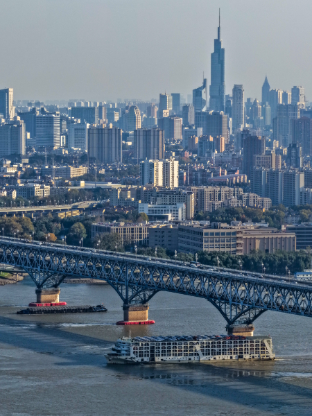 船只从南京长江大桥下驶过(2025年11月18日摄,无人机照片)。新华社记者 李博 摄