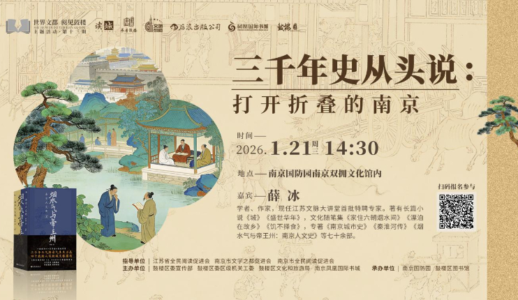 近日,“世界文都 阅见鼓楼”主题活动新年首场开卷。特约著名学者、作家薛冰老师携新作《烟水气与帝王州:南京人文史》,以“三千年史从头说:打开折叠的南京”为主题,在南京国防园双拥文化馆举办阅读分享会。