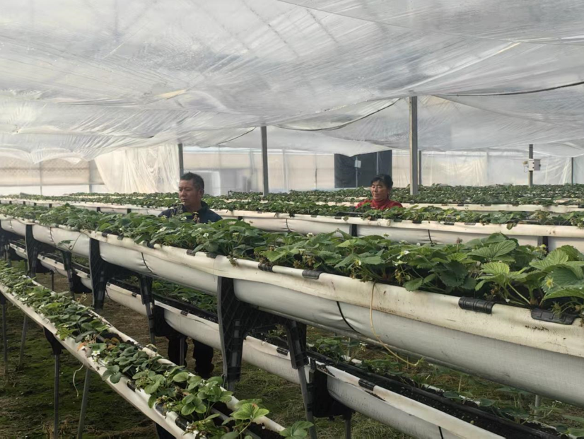 距离“天天有草莓园”不远处,一座现代化农业大棚格外引人注目。走进棚内,眼前的景象与传统种植方式大不相同——一排排立体栽培架上,草莓苗整齐排列,洁白的花朵点缀在绿叶之间,部分已经结出了青绿色的小果。“这是我们村的立体草莓栽培项目,目前草莓刚开花,预计再有一个月就可以采摘了。”杨庙村相关负责人介绍,这是省委驻淮帮促工作队2023年的重点帮扶项目,通过引进立体栽培技术,不仅节省了土地空间,提高了单位面积产量,还能实现精准灌溉和施肥,大大提升了草莓品质。立体栽培大棚内,自动化控制系统实时监测温度、湿度、光照等参数,确保草莓在最适宜的环境中生长。与传统种植方式相比,这种模式减少了病虫害发生。