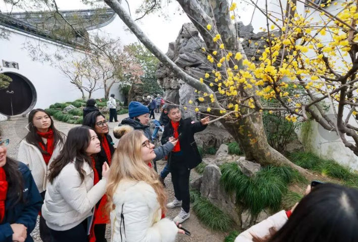 随后,在专业英文向导的带领下,外籍友人们漫步网师园。亭台水榭、曲径通幽的园林景致与处处点缀的春节装饰相映成趣,让大家在移步换景中,进一步领略苏州园林“咫尺之内再造乾坤”的造园智慧。