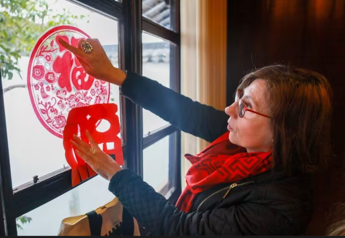 随后,嘉宾们兴致勃勃地参与到非遗体验中。在书法家刘训丰的指导下,不少外籍友人提笔尝试书写春联和“福”字;苏州剪(刻)纸非遗传承人王晓现场展示技艺,并带领大家动手剪出寓意吉祥的窗花图案。现场还设置了灯笼手作、特色印章打卡等互动环节,并陈列了桃花坞木版年画、苏灯、丝绸文创等苏州特色新春文创,形成了“可触摸、可创作、可带走”的沉浸式文化体验。