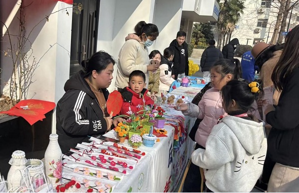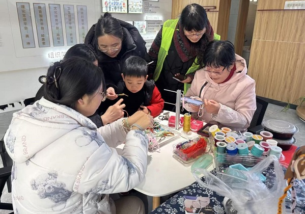非遗拓印、旧物改造手工坊、香囊手串编织等文化体验区前,几位巧手阿姨正用零散的彩珠、细线绳,串编成一条条别致的手串、手绳。“这编绳的尾梢编成调节扣,就不限制手围了。”张阿姨一边手指灵活地编结,一边笑着说道。一针一线凝结巧思,一拓一印传承文脉,活动在潜移默化中将中华优秀传统文化融入日常生活,既促进了交流,又增进了友谊。