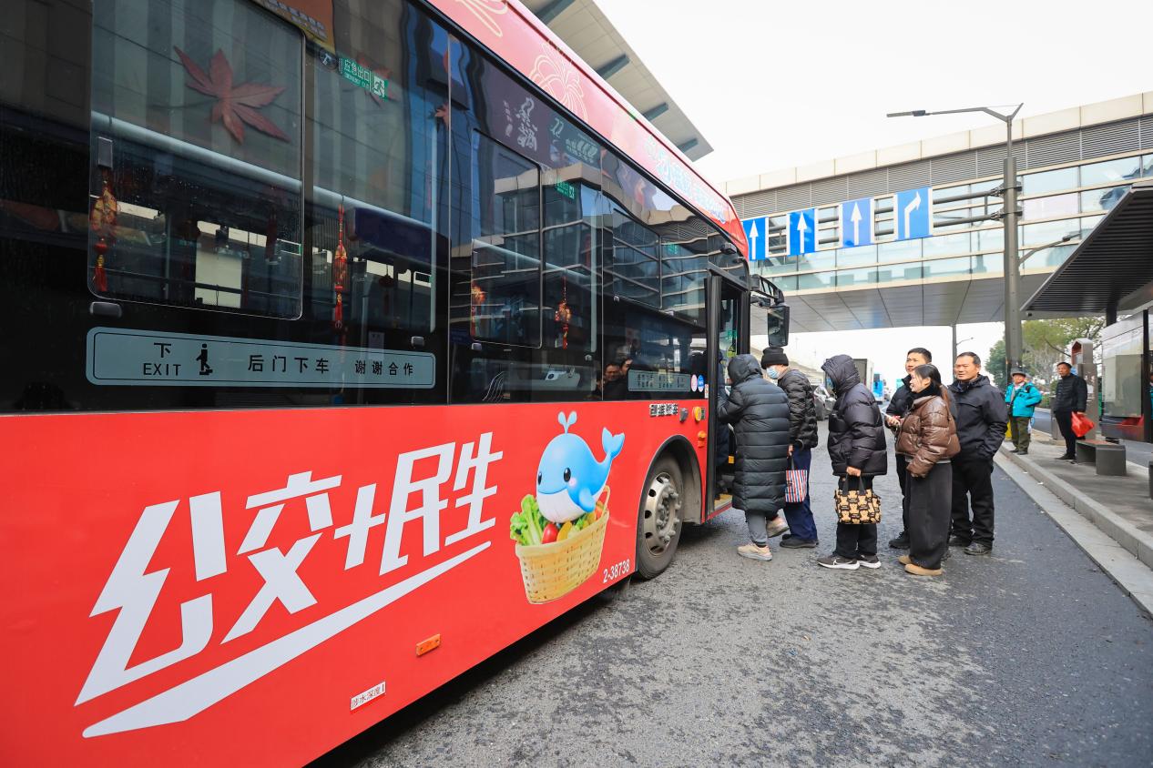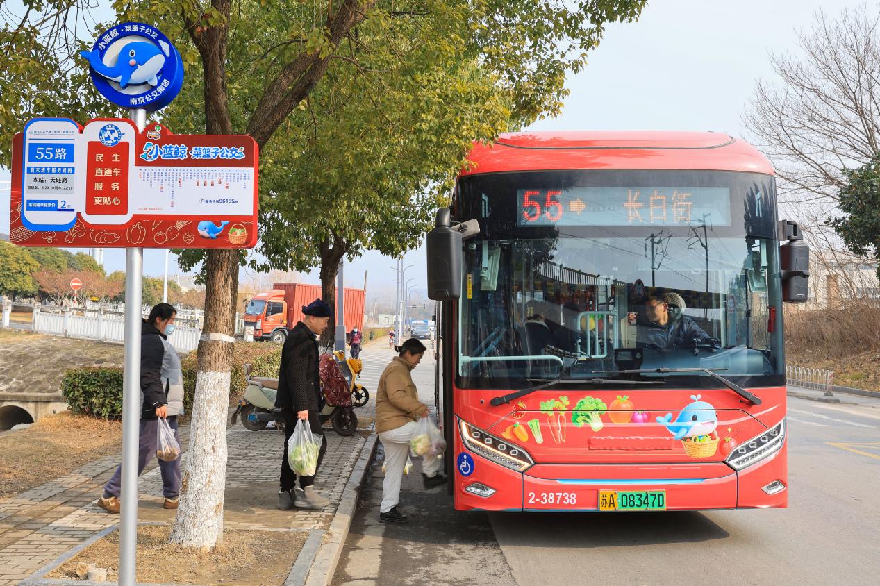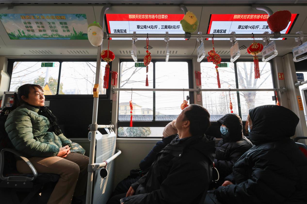 1月27日,南京首条深度融合公共交通与农贸消费的“小蓝鲸·菜篮子专线”在55路公交线上正式投入运营,该线路通过在车厢内设置的智能屏动态发布每日菜价信息,让市民在乘车途中即可了解行情、规划采购清单。(苏阳 摄)