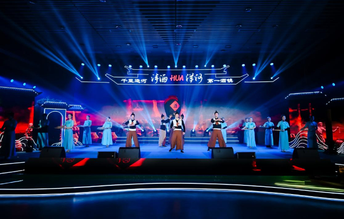 “诗是水中酒,酒是文中诗”,情景颂唱《诗意长河》的旋律响起时,舞台大屏上运河波光粼粼,演员们身着古装,以悠扬的歌声再现了唐宋至明清文人墨客因酒聚、以诗会友的场景。随后,古筝戏歌《渡来帆影阅古今》将琴筝雅韵与戏曲唱腔完美融合,“琴筝悠悠,渡来古今帆影;戏腔袅袅,唱尽诗酒风流”,现场观众仿佛穿越时空,置身于明清时期酒肆林立、商贾云集的洋河古镇。开窖仪式情境再现《醴泉争香》环节,酒工匠人们身着传统服饰,完整呈现开窖流程,醇厚酒香仿佛穿透舞台,让观众直观感受洋河酒的匠心酿造过程;主题歌曲《一醉千年》旋律婉转,唱出了洋河酒承载的时光记忆与文化底蕴。最令人动容的是现代诗朗诵《千里运河・第一酒镇》,朗诵者以铿锵有力的语调,描绘了洋河从运河古镇到产业新城的变迁,“一镇堪将天下醉,洋河的酒,醉了时光,醉了人心,更醉了新时代的发展宏图”,激昂的朗诵引发全场共鸣,掌声经久不息。而酒礼音舞诗画《酒礼合欢・天下洋河》则以艺术化的形式展现了中华酒礼文化,演员们身着传统服饰,行酒礼、颂酒德,将华夏文明的礼序与和美展现得淋漓尽致。