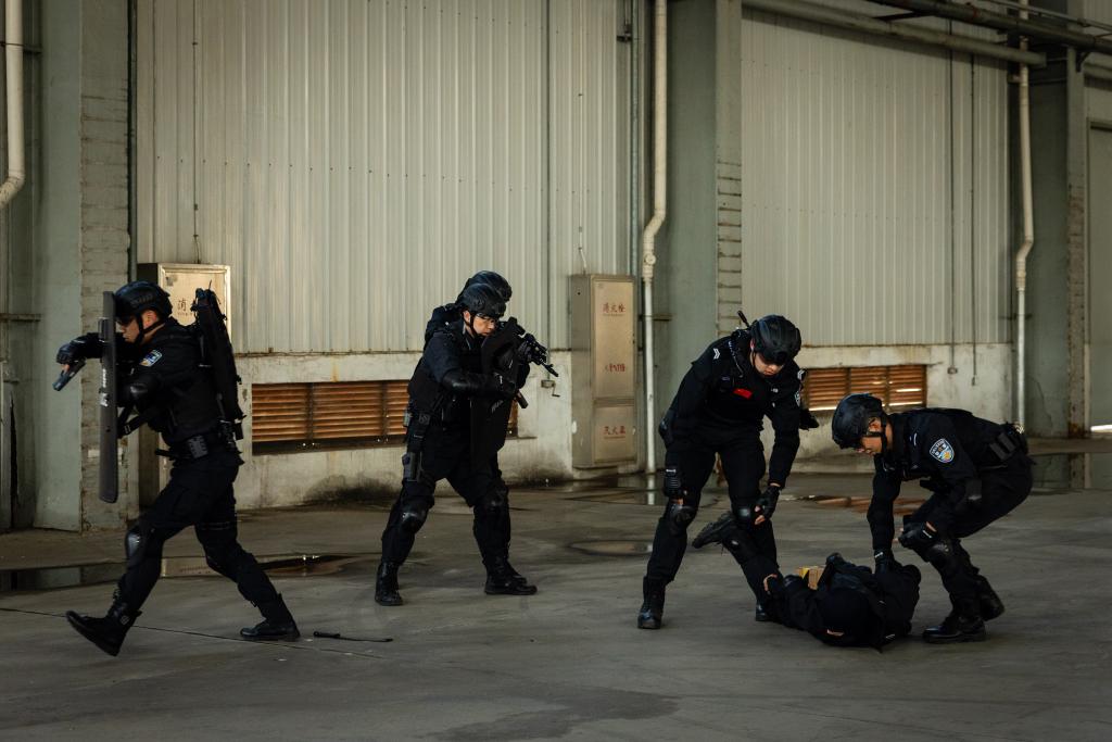 与此同时,搜查二组将另一“嫌疑人”逼入场区空置仓库后,“嫌疑人”负隅顽抗,拒不投降,现场指挥员迅速评估处置方案,果断下令实施强攻。狙击组在外围严阵以待,保持警戒;突击组在门外完成攻击前准备,随后投掷爆震弹掩护突入,最终成功制服“嫌疑人”。民警们配合默契,展现出高超的战斗技能和应急处置能力。