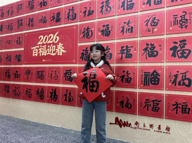 现场来南图看书的张女士一进门便被“百福墙”吸引,她说:“一下子就有过年的气氛了!”她领取了一个福字,打算带回安徽老家贴在门上,增添喜气。同样带着女儿来馆看书的蒲先生手捧多张“福”字,满脸喜气,在他看来,这也是让孩子近距离感受书法艺术、接触传统文化的好机会。