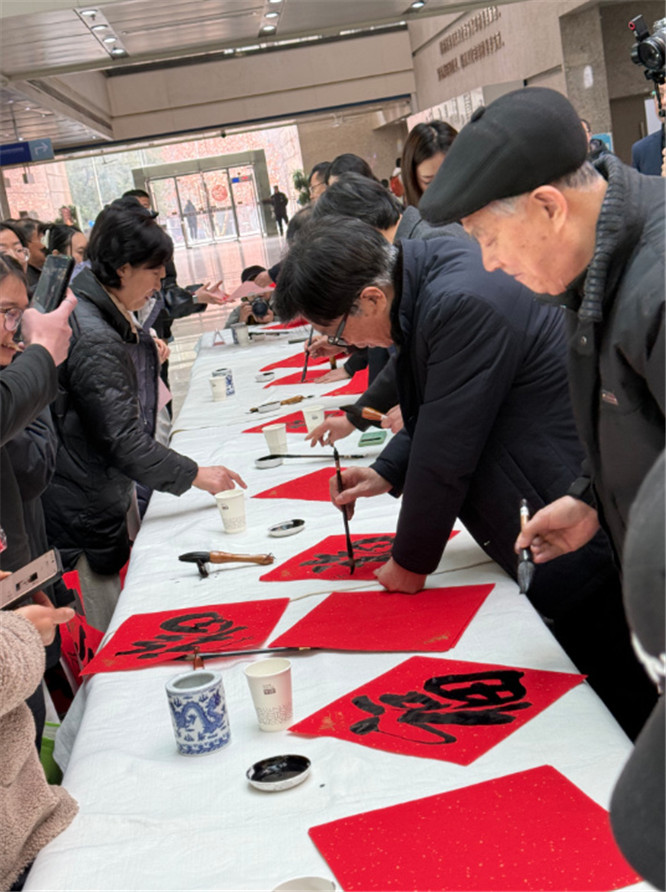2月3日上午,南京图书馆举行隆重的“百福墙”揭幕仪式,方祖岐、冯敏刚、冯健亲、章剑华、赵绪成、杨企鹏、管峻、陈军、韩显红共同为百福墙揭幕。揭幕仪式后,诸多书法家亲临现场挥毫写福、赠福予读者,吸引了大批市民踊跃参与。大家近距离感受笔墨神韵,亲手领取新春福气,现场洋溢着喜庆祥和的氛围。
