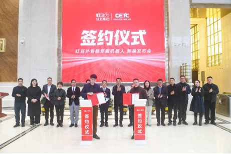 科技共生,未来以来。2月5日,红豆集团旗下无锡福芯机器人有限公司与中国电子科技集团公司旗下中电科机器人有限公司在无锡正式签约合作,并共同发布首款合作成果——轻量型髋关节助力外骨骼机器人。红豆集团董事局主席周海江出席发布会并发言。中国电科第21研究所副总工程师、机器人研发中心主任王洪武,红豆股份董事、无锡福芯机器人公司总经理奚丰作为双方代表进行签约。