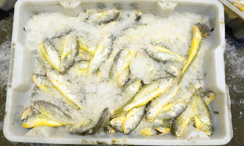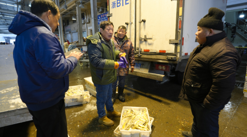 西大门上演带鱼争夺战,东大门的小黄鱼同样备受青睐。卸货区的白炽灯下,一条条小黄鱼通体金黄,泛着诱人的光泽。“年货市场价格比平时高一些,像小黄鱼,每箱能卖到250元,品质越好价格越高。”经营户张大叔从渔港一次性收购了20箱小黄鱼,目前已被各大菜市场的海鲜商贩预订了大半。