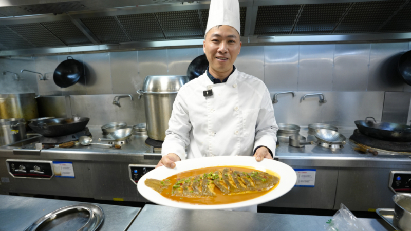 “油先热锅,再下葱姜蒜辣椒,轻轻放入板鱼,老抽上色、陈醋提味……”如东锦恒君澜酒店的后厨里,厨师周鑫元正专注地烹制着一道招牌红烧大板鱼。据他介绍,大板鱼肉质细嫩,经浓汁慢炖10分钟后,外皮酥香,内里入味,特别符合本地人对鲜美的追求。