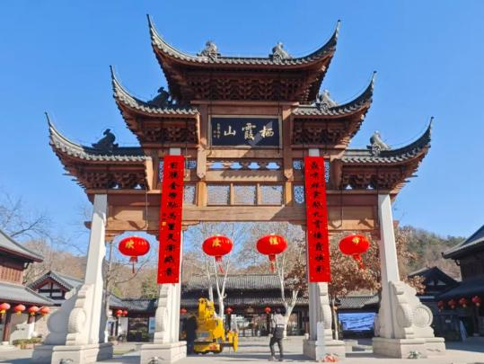 栖霞山的新春,从一场视觉与氛围的营造开始。山门牌坊高悬“栖霞山大春联”,墨香承古意。