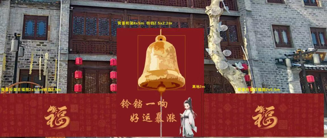 即日起至23日,现场设置巨型“百福墙”与祈福铃铛装置。游客可亲手执笔,在百福墙上描摹属于自己的“福”字;亦可摇响清脆铃铛,在声声回响中寄托对新年的美好祈愿。