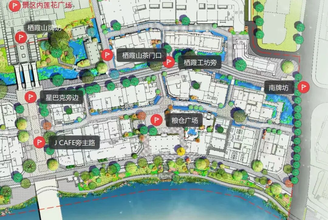 一队路线:星巴克→栖霞山茶→栖霞工坊→南牌坊→粮仓广场→J CAFE