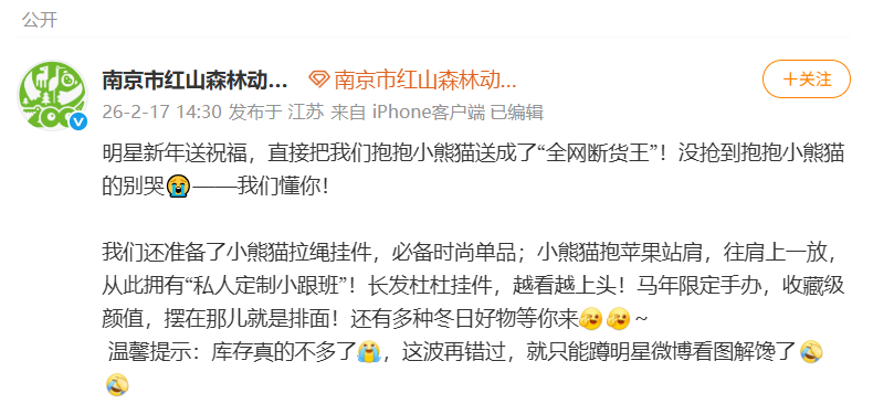 2月16日除夕,肖战发文给网友拜年送祝福,眼尖网友发现肖战晒出的是南京红山动物园小熊猫玩偶,这引发不少粉丝、网友的购买热潮。话题“肖战被红山动物园顶流小熊猫圈粉”更是火上热搜!