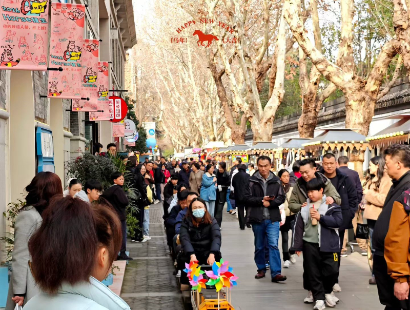 祥龙摆尾,瑞马探头。一转眼,今天已是正月初四,春节的喜庆正如火炉上咕嘟着的暖茶,热气腾腾,韵味正浓。走亲访友的间隙里,越来越多市民选择走出家门,在熙攘与欢笑中感受这座城市的年味。南京的各大商圈早已“卷”起了新春氛围:艾尚天地的祈福墙前挂满了心愿,非遗市集里飘着手作的温度;德基广场“织见凌霄”的梦幻主题下,AR互动让人仿佛踏入凌霄宝殿,与仙马同游;六角广场的“马贺新春”系列活动,从狮王争霸到财神快闪,热闹非凡;南京商厦更是联手中央门灯市,办起汉服文化节,让人一时分不清是穿越回了上元灯会,还是传统正以最时尚的方式与我们重逢。