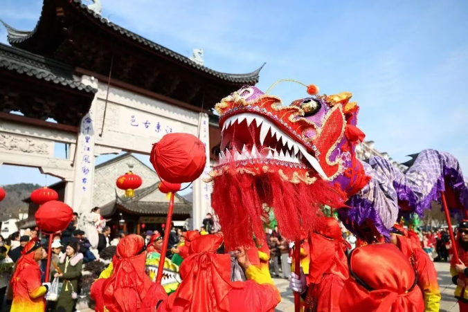 高淳东坝大马灯、溧水骆山大龙等非遗巡游热闹开演,六合金牛湖湖鲜盛宴、江宁钱家渡水乡年俗体验各具特色。村宴、村晚、年货大集,让人们尽享乡村田园团圆之乐。