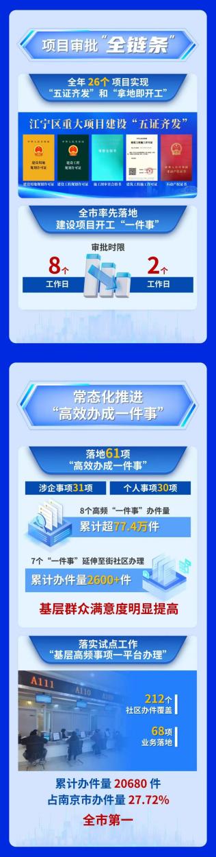 全链审批是江宁营商服务的特色品牌,37.4万户经营主体是江宁经济发展最大的底气。今年,江宁正开展全链审批服务3.0提优行动,持续优化区“全链审批服务平台”,完善“线上预审、线下交件”模式,实时跟踪审批进度,实现主动提醒、精准调度;完善工程项目审批知识库,为企业提供智能精准辅导。