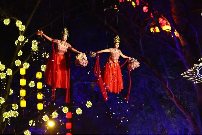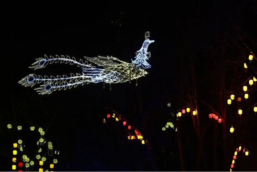 飞天凤凰:结合现代光影的空中表演,凤凰空中翱翔,点亮栖霞山的夜。
