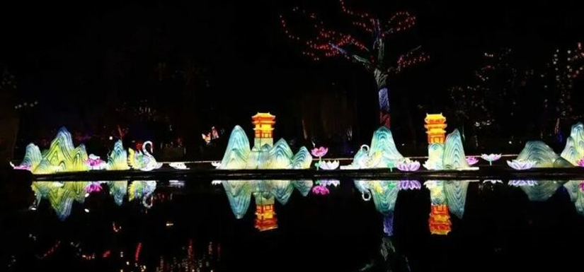 明镜湖边树木华彩焕新,湖心亭四周的金鱼花灯灵动飘逸,似在水中游动。特别要说到湖中的《万里江山》,将祖国的大好河山汇聚一湖,实为震撼。