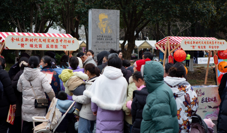 逛“可观可享”的非遗集。华灯初上,沿河东路上的“乐享文明汇 乐道金坛集”热闹开张,金坛刻纸、面塑、蛋雕等40余个非遗展位一字排开,手艺人现场献技,市民沉浸式感受“家门口”的年味。这里不仅是文化的秀场,更是惠民的窗口——“学雷锋”公益集市上,“反诈问答大闯关”人气高涨;区商务局组织的家电、汽车销售及国补政策宣传台前咨询不断;区人社局设立人才招聘专区排起长队……一个“可观、可玩、可购、可聘、可享”的元宵新场景,在灯火中徐徐展开。