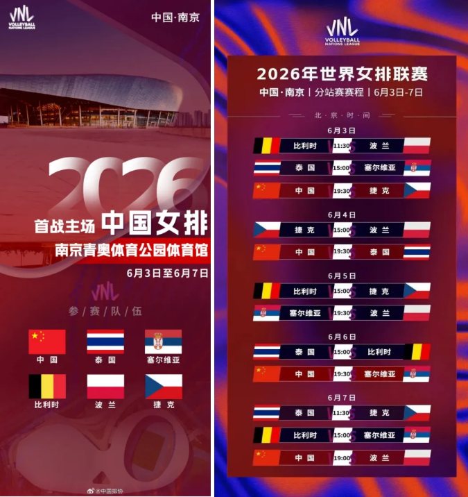 作为全球最高水平的排球赛事之一,2026年世界女排联赛(中国·南京站)将于6月3日—7日在南京青奥体育公园体育馆打响,这也是中国女排新赛季的主场首战。中国、泰国、塞尔维亚、比利时、波兰和捷克的6支世界顶尖女排国家队齐聚金陵,展开12场巅峰对决,为市民和球迷带来世界级的排球观赛体验。