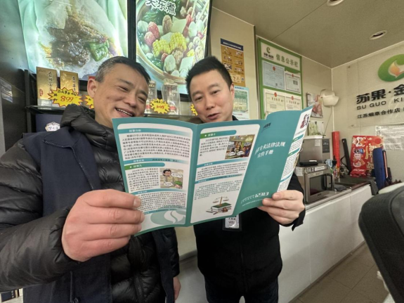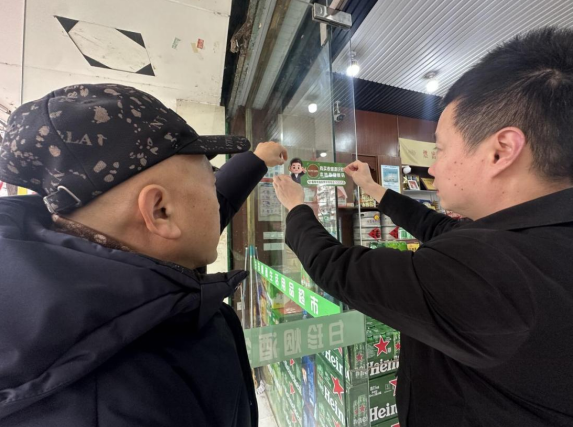 工作人员在南京南站周边零售户开展店内联合普法